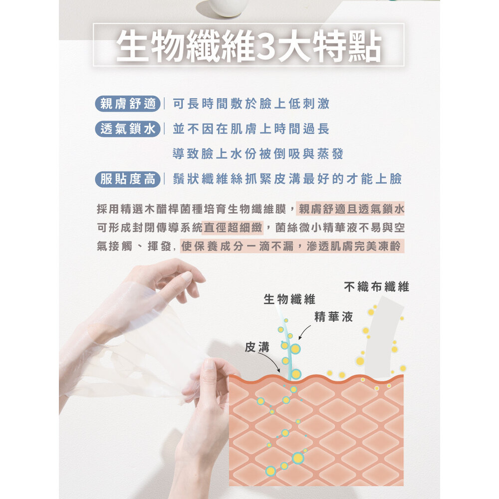 ★生物纖維布膜:可深入皮溝與肌膚緊密貼合,清潔肌膚、油水平衡、淨化毛孔、改善粉刺