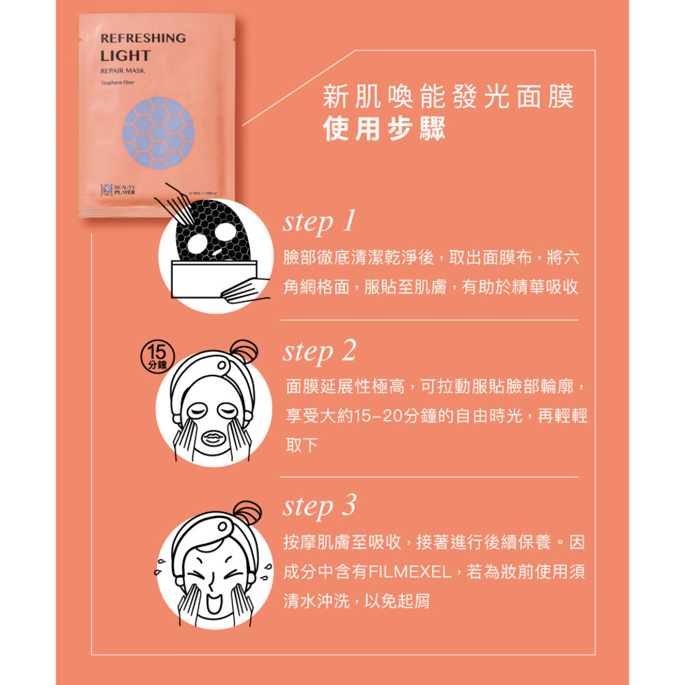 ⧕獨家研製:「石墨烯活導纖維膜」,媲美面膜界的 「肌膚美容儀」,淨膚、活絡、傳導,一片搞定。